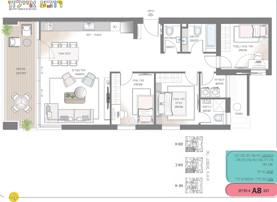 פרויקט רובע איילון בלב בת ים המתחדשת, מציע דירות מעוצבות 2,3,4,5 חדרים, מיני פנטאהוזים ופנטהאוזים שובי לב, במגדלים חדשניים עם נוף עוצר נשימה של כל גוש דן. כל הדירות בפרויקט רובע איילון מתוכננות בקפידה על מנת ליצור שטח פנימי פונקציונאלי להנאה מקסימלית, לרבות מרפסות רחבות המעניקות הרגשה של בית פרטי במגדל. המפרט הדירתי המושקע לצד העיצוב והתכנון הייחודי של המגדלים וסביבתם, מציעים חוויית מגורים לא פחות ממושלמת. בכל מגדל לובי כניסה מפואר בעיצוב אדריכלי גבוה, לובאים קומתיים מעוצבים, פיר אשפה קומתי חכם, קירות מסך,